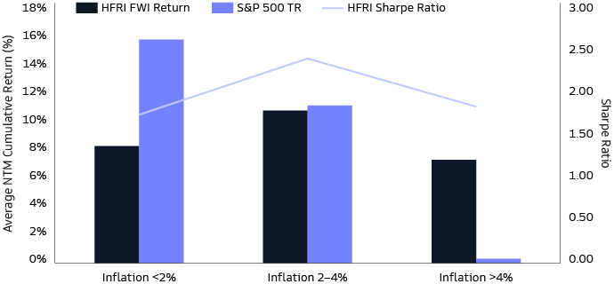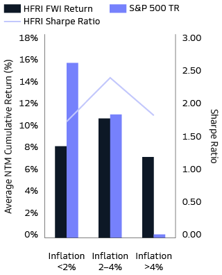 Historically, the hedge fund industry has displayed a strong positive relationship between higher inflation and higher interest rate regimes and better hedge fund performance.5 In periods marked by low inflation,6 hedge funds have generated absolute returns that are approximately half (52%) of those available to equity investors; in periods of high inflation,7 hedge funds have materially exceeded US equity market returns. When inflation has been close to the Fed's long term target of 2%, we see that hedge fund returns were roughly in-line with equities; however, hedge funds have generated these returns with significantly lower volatility due to the relative value orientation of many hedge fund strategies, resulting in a Sharpe ratio greater than 1.0, as illustrated in the chart below.