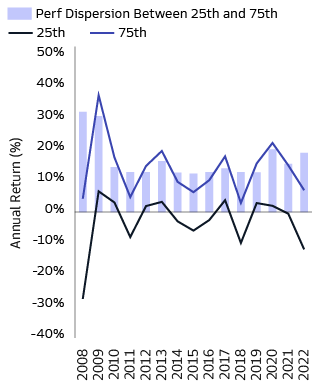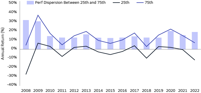 When looking at our hedge fund database since 2008, which is comprised of more than 8,000 hedge fund strategies, we found a persistent dispersion of greater than 10% return between the 25th percentile and 75th percentile hedge fund managers. This dispersion increased during more volatile market environments (i.e., 2008, 2009, 2020, and 2022), averaging an annual return dispersion of over 20%, as shown in the chart below. Interestingly, when analyzing the sub-strategy level performance on a beta-adjusted basis (e.g., a measure of the skill-based return, or alpha of managers), the Information Ratio dispersion is notably wide across strategies and across various time horizons.