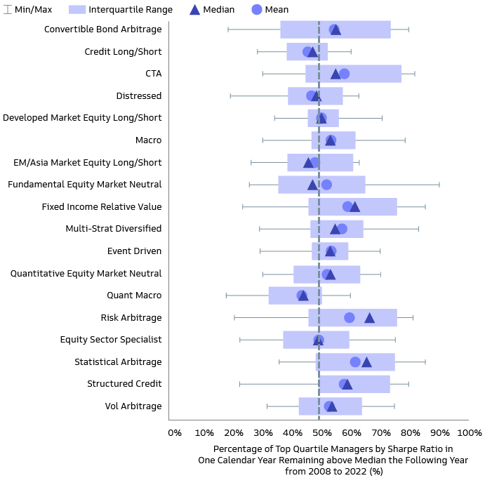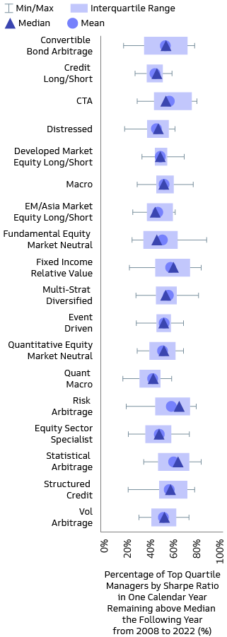 While underwriting a strategy and assessing the ever-changing hedge fund universe may be difficult, the ability to identify skill can help to compound returns over time. We have historically observed that skill may adapt, and skill may persist. For example, using risk-adjusted returns as a proxy for skill, a manager that achieves a top quartile Sharpe Ratio ranking in one year is likely to be above the median manager the following year as well, as shown in the chart below. Although it is ill-suited to evaluate a hedge fund based on a single year’s performance, it is notable that this persistence of skill is consistent across strategy types, with credit long/short and quant macro the lone exceptions. In the world of hedge fund investing, we believe the persistence of skill translates to alpha. And alpha translates to returns that are diversifying and can meaningfully enhance the risk-adjusted returns of an overall portfolio.