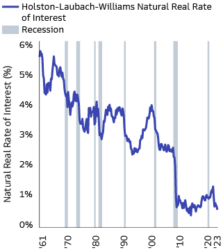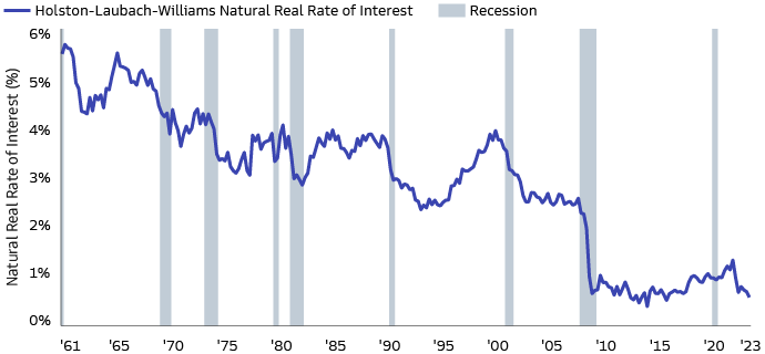 A potential starting point for investors is to consider the outlook for monetary policy. It is viewed as “neutral” and therefore neither stimulating nor restraining the economy, if the policy rate is aligned with the sum of inflation target and the so-called “r-star,” the natural real rate of interest. The US r-star rate is currently estimated to be around 0.5%, compared to nearly 4% in 2000 and even higher in the 1960s, according to the Federal Reserve Bank of New York’s Holston-Laubach-Williams model. Other studies have also found a similar downward trend over past decades.2 This may have been driven by structural factors such as demographic aging, a global savings glut, productivity declines, and so on. While it is difficult to state where r-star is heading, we believe some shifts in these factors are worth noting.