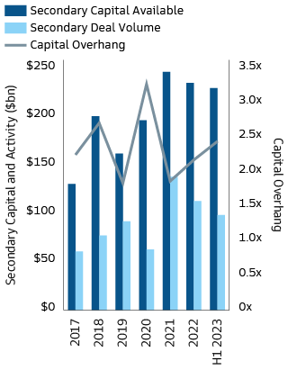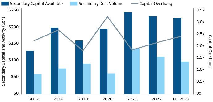 Source: Jefferies Global Secondary Market Review – July 2023. Capital overhang = capital available / deal volume.