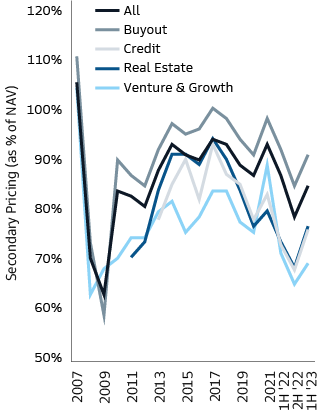 Discounts in the secondary market will also reflect the complexity involved in the transaction, as well as the type, quality, and familiarity of the assets involved. As such, the most efficient pricing in the secondary market remains for traditional buyout fund stakes, which represented 72% of secondary transaction volume in 2022 and 1H 2023.4
