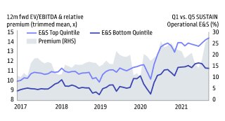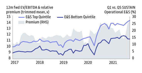 Source: FactSet, Goldman Sachs Global Investment Research. Reflects 12m forward multiple of top quintile of companies in the GS SUSTAIN E&S headline rank vs that of the bottom quintile; Q5 is 5th quintile. As of September 2021.