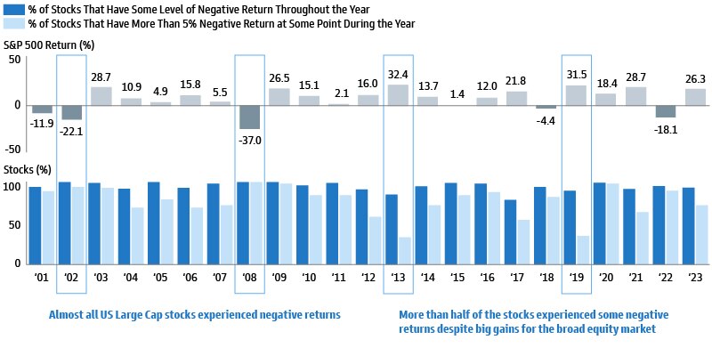 No, not at all. The purpose of tax loss harvesting is not to pick losing stocks. It is simply to potentially help investors benefit from naturally occurring market volatility and dispersion in stock returns. Think about it this way: even in years when an index such as the S&P 500 delivers a positive return, not every single stock in the index has a positive return throughout the year. Some stocks experience losses throughout the year and may even end the year in the red.